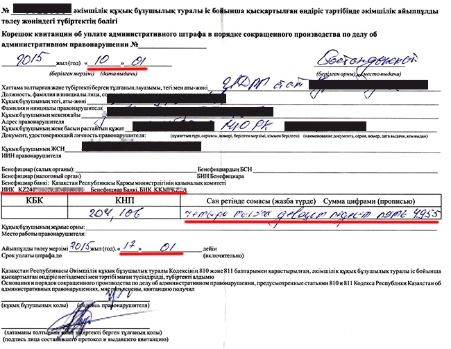 При этом, чтобы нарушителю выдали скидочный квиток, водитель должен признать свою вину. Если же он не согласен с нарушением, ему попросту выпишут стандартный протокол на полную сумму штрафа. К слову, на скидочной квитанции указывается крайний срок уплаты штрафа (через семь дней) и уменьшенная сумма. К примеру, если штраф составил 5 МРП (9 910 тенге), в квитанции будет значиться ровно половина, то есть 4 955 тенге. Именно эту сумму и необходимо уплатить.