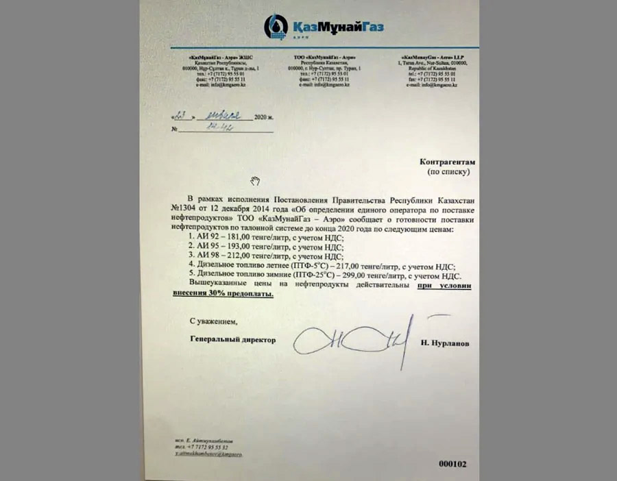 Так, в соцсетях распространили письмо КМГ о том, что компания "КазМунайГаз -Аэро" готова предоставлять нефтепродукты по талонам до конца текущего года по ценам 181 тенге за литр бензина АИ-92, 193 тенге за АИ-95 и 212 тенге за литр АИ-98.