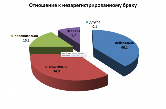 Отношение респондентов к незарегистрированному браку преимущественно нейтральное (40,1%), у каждого третьего (34,9%) - отрицательное, только каждый шестой (15,2%) одобряет такую форму брачно-семейного союза.