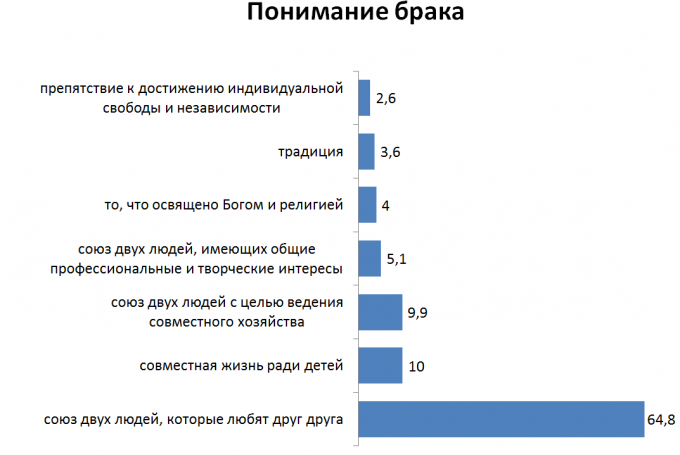 Так, опрос показал, что основным мотивом вступления в брак для большинства – 70% - является желание создать семью, чувством любви руководствуются 63,1%, желанием иметь детей - 37,1%, независимостью от родителей – 10,5%, беременностью - 7,0%.