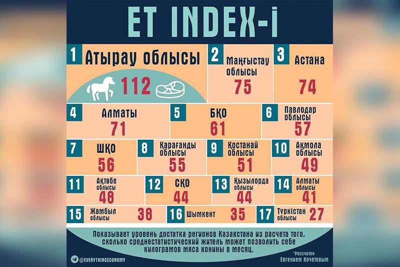Иными словами, это своеобразная альтернатива индексу «Биг Мака», который рассчитывает The Economist ежегодно. За основу казахстанского индекса было взята возможность населения по покупке мяса конины.