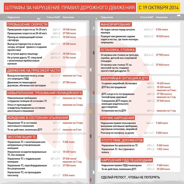 Между тем, LS напоминает, что в Казахстане с 19 октября 2014 года вступают в силу новые штрафы за нарушения правил дорожного движения.
