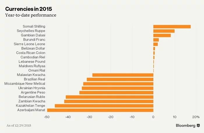 Среди укрепившихся валют мира в 2015 году: сомалийский шиллинг, сейшельская рупия, гамбийский даласи, бурундийский франк, сьерралеонский леоне, белизийский доллар, костариканский колон, камбоджийский реал, ливанский фунт, мальдивская руфия, оманский реал.