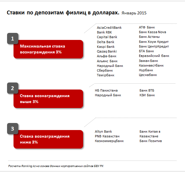 В условиях дедолларизации экономики лишь четыре банка второго уровня предлагают ставки по розничным валютным вкладам более 3%. Об этом сообщает аналитическая служба Ranking.kz.