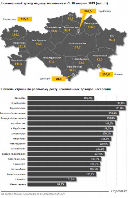 Регионом с самым низким доходом остается Туркестанская область, показатель здесь составляет 47,7% от среднереспубликанского уровня. Разница между максимальным и минимальным значениями среднедушевых номинальных денежных доходов населения среди регионов в третьем квартале 2019 года составила 4,4 раза (в третьем квартале 2018го — 4,5 раза).