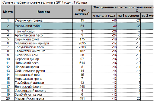 Остальные "слабые" валюты держатся от лидеров на почтительном расстоянии: ганский седи и аргентинский песо, идущие следом, обесценились всего на четверть.