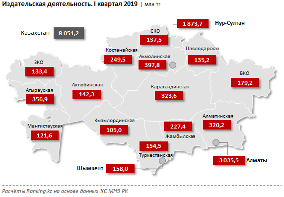 По данным Ranking.kz несмотря на рост потребности в тех же учебниках, общий объём издательских услуг в I квартале текущего года составил всего 8,1 миллиардов тенге — на 18% меньше, чем годом ранее. Практически две трети всего объёма услуг оказано компаниями Алматы (37,7% от РК, 3 млрд тг — на 13,9% меньше, чем в аналогичном периоде прошлого года) и Нур-Султана (23,3% от РК, 1,9 млрд тг — сразу на 40,7% меньше, чем годом ранее).