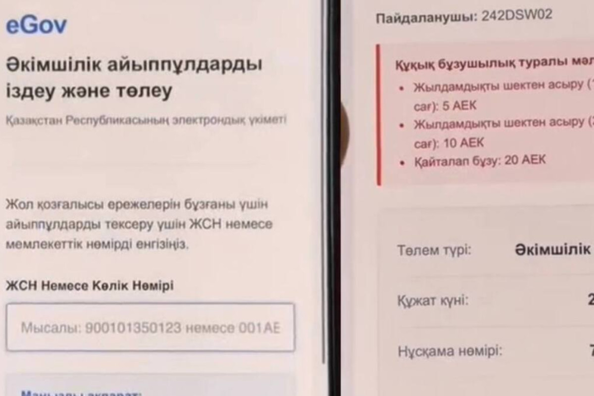 На первый взгляд ссылка выглядит как официальный государственный портал. Однако это — поддельный сайт. Мошенники создают фальшивый интерфейс, оформленный под портал eGov. На этом поддельном сайте, даже если ввести любой номер автомобиля или ИИН, система автоматически показывает ложную информацию о наличии ”штрафа”. Это сделано для обмана пользователя и повышения доверия.
