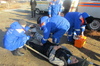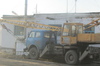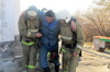 Прибывшие на место ЧС спасатели ВРАОСО с помощью гидравлического аварийно-спасательного инструмента извлекают пострадавшего из кабины автокрана.