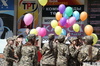 Такой флэшмоб ребята устроили после смотра строевой подготовки в школе. Прошагав бравым маршем с песней «Катюша», они под крики «Ура!» выпустили в небо воздушные шары, а затем принялись раздавать прохожим гвардейские ленты. Получившие такие подарки, особенно люди старшего возраста, были очень благодарны ребятам. Покинули улицу старшеклассники точно также, строем, шагая в ногу.