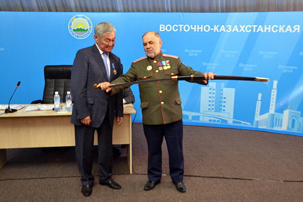 Ответную награду акиму области преподнес представитель Общества славянской культуры ВКО Александр Яковлев.