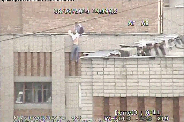 На съемке камеры слежения, установленной на соседнем доме, видно, как мужчина сидит на самом краю крыши, свесив ноги вниз. Затем он лёг, согнув колени. Снова сел. Попробовал слезть по стене, держась за карниз руками. Подтянулся, снова залез на крышу. Несколько раз повторил свои действия, опасно балансируя на высоте около 30 метров над землёй. За это время его успели увидеть очевидцы и позвонили в Центр оперативного управления ДВД ВКО.