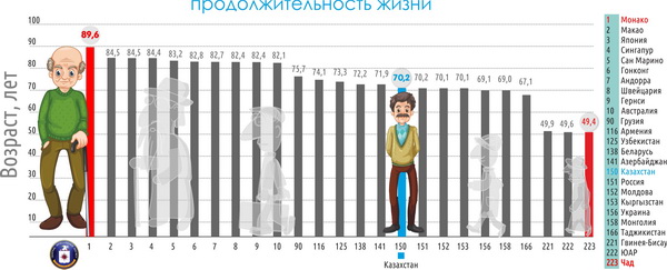 Из стран СНГ дольше всех живут в Грузии (90 место) – 75. 72 года. Казахстан оказался на 150 месте, средняя продолжительность жизни - 70.24 года, обогнав своих потенциальных партнеров по Евразийскому Союзу - Россию (151 место) и Киргизию (153), а также Украину (156). возраст
