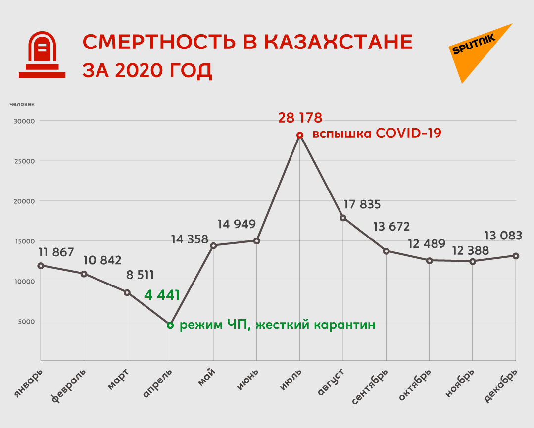 При этом, по официальным данным, в Казахстане от коронавируса с марта по декабрь 2020 года скончались 2 284 человека. От пневмонии с признаками коронавируса с августа по декабрь умерли 503 пациента. Больше всего люди умирали в июле – в пик эпидемии. Меньше всего – в апреле, когда в республике действовал жесткий локдаун.