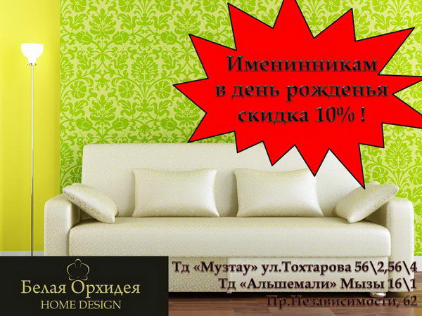 Но и это еще не всё. Отныне в филиалах «Белой Орхидеи» стартует акция «Подарок имениннику». Это значит, что посетив любой из наших филиалов в день рождения, вы получаете в подарок скидку 10% на любой вид товара.