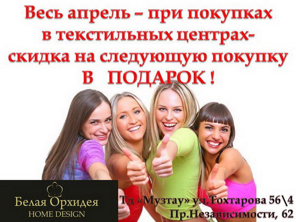 В текстильных центрах по пр.Независимости, 62 и в ТД «Музтау» весь апрель при покупке на любую сумму вы получаете разовый купон на скидку без срока давности.