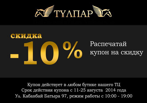 У нас для вас подарок – распечатай купон и получи скидку в любом бутике нашего торгового центра. Купон разовый и действителен с 11 - 25 августа 2014.