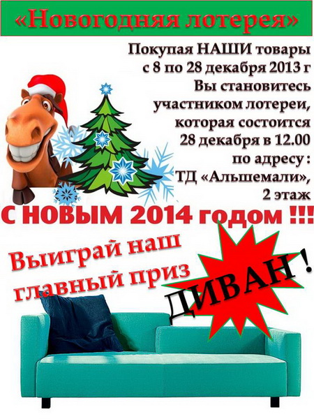 Но и это еще не все приятности, которые мы приготовили в канун Нового года!Также с 8 по 28 декабря абсолютно каждый гость студии, совершивший покупку в шоу-руме в ТД «Альшемали» или в текстильном центре на Независимости, 62, получает лотерейный билет на праздничный розыгрыш, который состоится 28 декабря в 12.00 в нашем шоу-руме в ТД «Альшемали». Вас ждет огромное количество подарков, памятных и вкусных неожиданностей, развлекательная программа и конечно наш главный приз – диван!