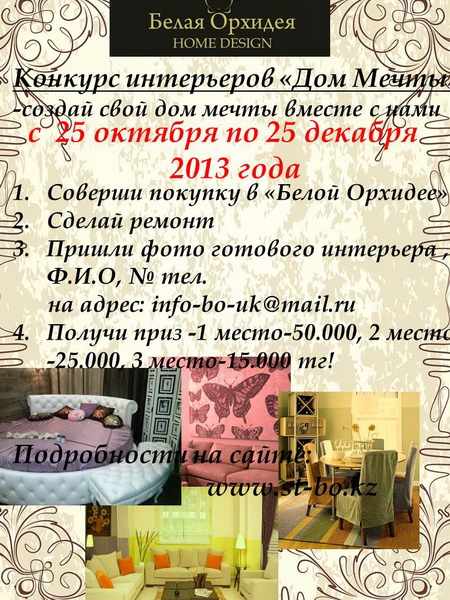 [email protected]. Автор лучшего фото будет по праву вознагражден на праздничном розыгрыше в 12.00 28 декабря 2013 года. Узнать подробности проведения конкурса интерьеров вы можете на нашем официальном сайте: www.st-bo.kz