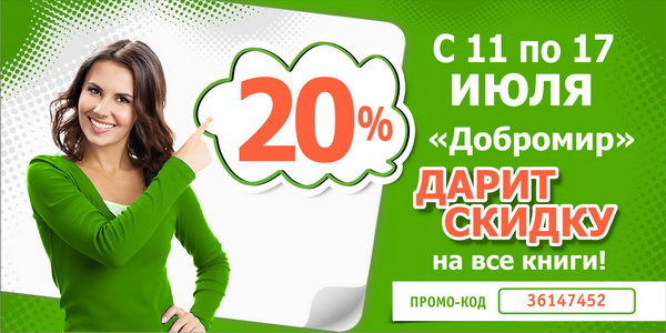 В ответ на многочисленные пожелания наших покупателей с радостью сообщаем, что в интернет-магазине «Добромир» теперь появились и книги. В честь этого события мы дарим своим покупателям скидку 20%* на все издания! Скидка будет действовать с 11 по 17 июля. Для того чтобы воспользоваться ею достаточно ввести в специальное поле корзины данный промо-код и нажать кнопку «Пересчитать скидку».