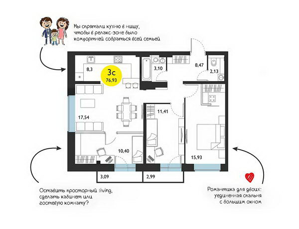 В квартире для большой семьи важно, чтобы каждый квадратный метр использовался максимально эффективно. В ЖК «Ясный берег» — индивидуальный подход к проектированию квартир: учитываются потребности всех членов семьи. Особенным спросом пользуется популярное в Европе планировочное решение — просторный living (гостиная, совмещенная с кухней), где вся семья собирается вместе в теплой обстановке.