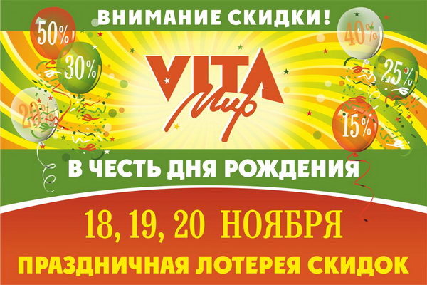 В честь дня рождения сеть магазинов «VITA-Мир» и «Саби» приглашает всех за отличным настроением и приятными сюрпризами!