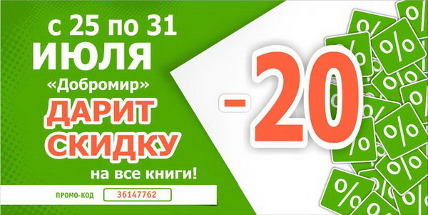 А чтобы совершать покупки было не только интересно, но и выгодно, «Добромир» дарит своим покупателям скидку 20%* на все книги! Скидка будет действовать с 25 по 31 июля. Для того чтобы воспользоваться ею достаточно ввести в специальное поле корзины данный промо-код и нажать кнопку «Пересчитать скидку».
