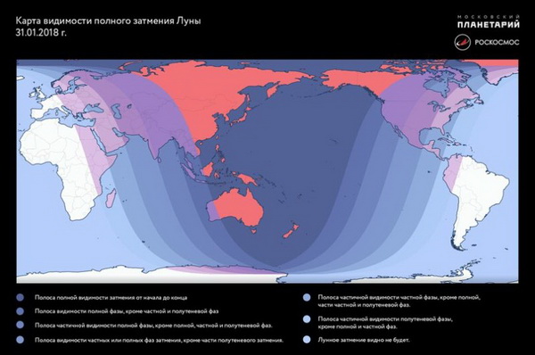 31 января с 15:48 до 21:11 (время Астаны) полное затмение Луны будет видно в России. Затмение Луны также будет видно из Восточной Европы, Восточной Африки, Азии, Австралии, Тихого океана и Северной Америки. Луна в ходе своего движения по орбите погрузится в южную часть тени Земли. Земная тень полностью затмит видимую поверхность Луны, придав ей спутнику красновато-бурый оттенок.