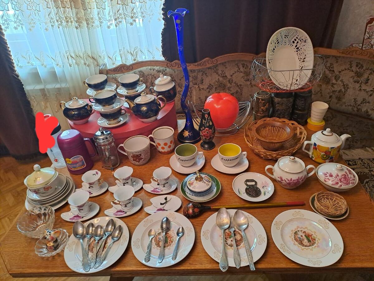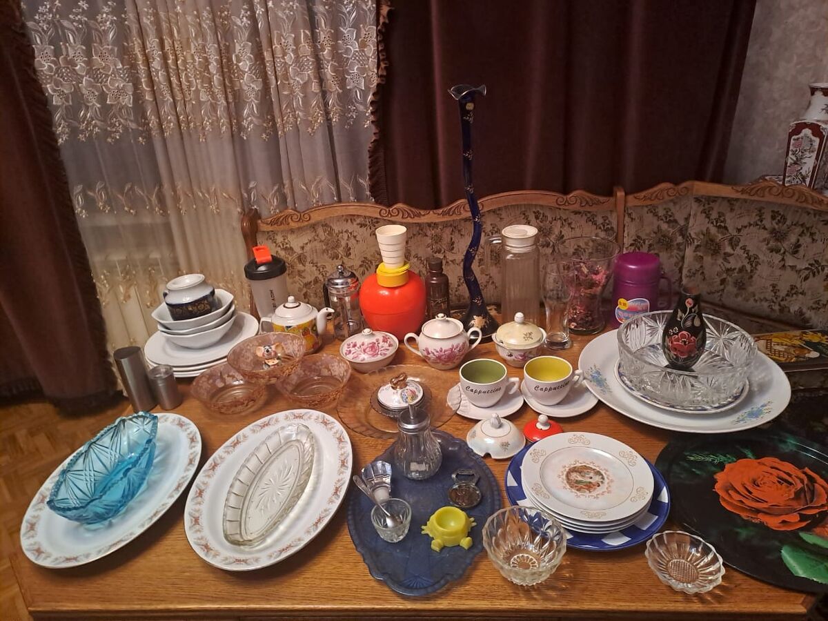 Овощерезка 3500, кувшин для фильтра 1450,термос-кружка 1200,чайник -пресс новый 2950,подставка под вилки, ложки 1450,фляжка солдатская 750 , шкатулка-конфетница яблоко 1500,кувшин для сока 1500