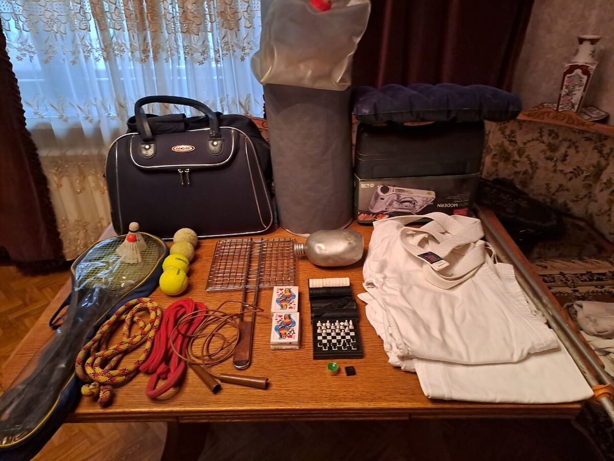 Шашки 2500,шахматы дорожные (не хватает несколько фигур) 1500,барбекюшница 2500,бадминтон 1500-2500,крюки 2ш. 1500,емкость для воды с краном складная 3500,подушка надувная новая 1950,фляжка солдатская 750,плитка походная газовая Ю.Корея (требуется замена прокладки ) 3500.